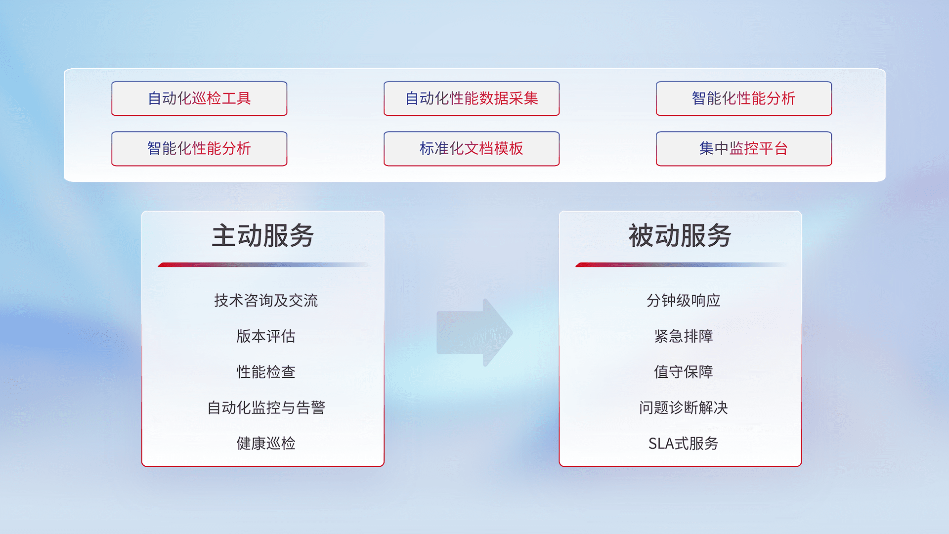 智能化工具和标准化文档,,保障服务质量,,,,提供主动服务(包含技术咨询、、版本评估、、、性能检查、、自动化监控与告警、、健康巡检)和被动服务包含(分钟级响应、、紧急排障、、、值守保障、、、、问题诊断解决、、、、SLA服务)。。